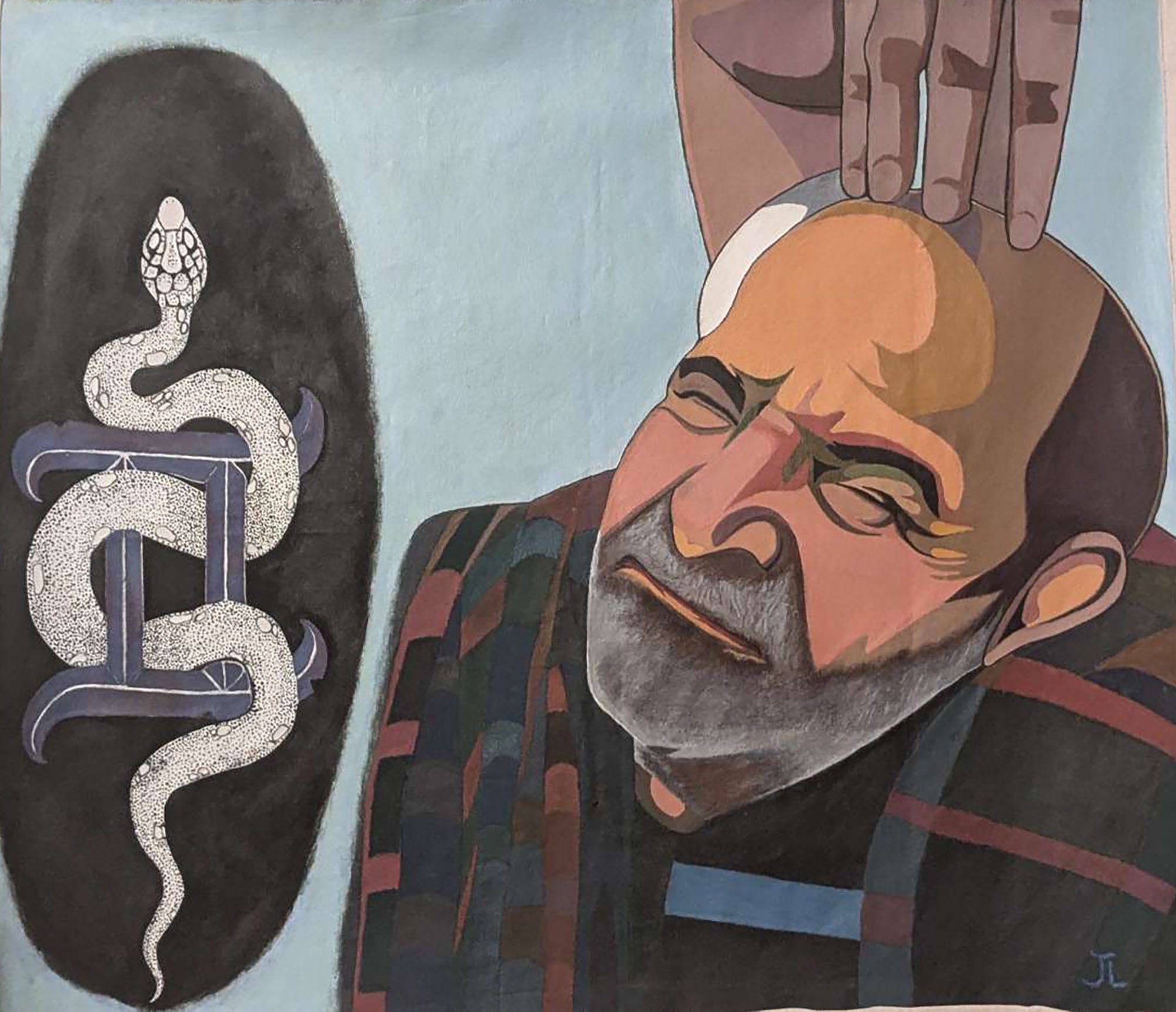 The painting was inspired by Karoli Baba's devotee, one who was born Gemini and the year of the serpent. It features a serene sky blue background that evokes peace and spirituality. At the center, Karoli Baba is depicted in vibrant multicolor shades, radiating wisdom and compassion. His inquiry posture blends deep brown, rich orange, and calming blue, symbolizing his multifaceted teachings.Gemini and the serpent represent duality and transformation; Gemini, depicted as twins, embodies versatility, intellectual curiosity, and adaptability. The serpent, found in various mythologies, symbolizes wisdom, rebirth, and spiritual awakening, with its ability to shed skin representing renewal. Together, they signify a blend of intellectual exploration and profound change, urging growth through knowledge and the shedding of old beliefs to embrace new perspectives and opportunities.